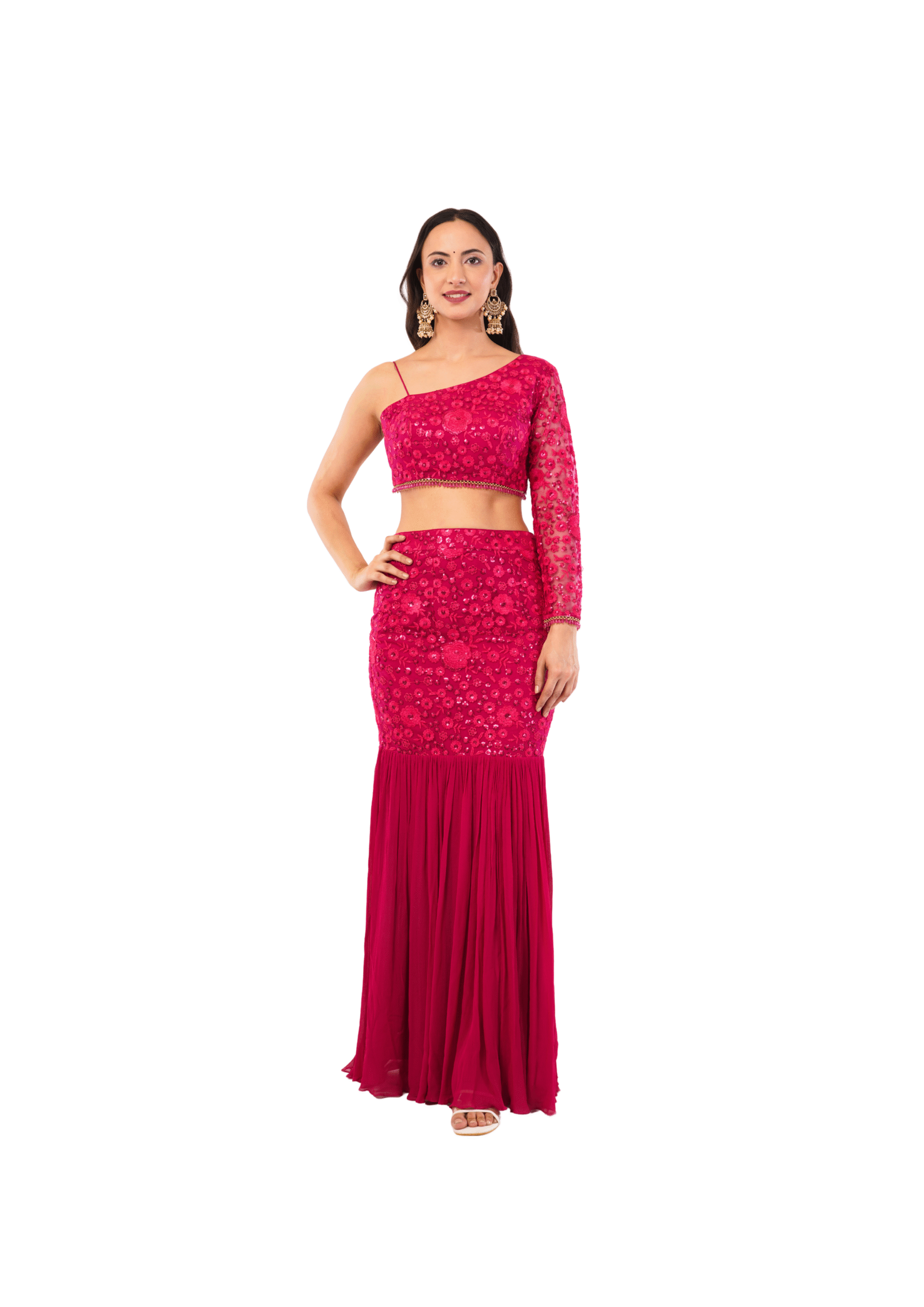 The lehenga set showcases intricate sequin embellishments and features one full-length sleeve, while the other shoulder is elegantly bare with a delicate strap. The mermaid-style lehenga skirt is beautifully crafted with matching sequined patterns throughout the fitted portion, flowing into a dramatic flared bottom with gathered georgette fabric. Perfect for wedding celebrations, formal occasions, and festive events, this modern take on traditional Indian attire combines sophistication with contemporary style. The rich red color and luxurious embellishments make this outfit a captivating choice for those special moments.